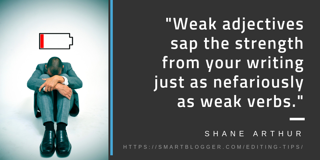 Weak adjectives sap the strength from your writing just as nefariously as weak verbs. Use the best adjectives possible when describing nouns and pronouns. And be mindful that certain words, like really and very, usually precede weak adjectives. Take a look:
